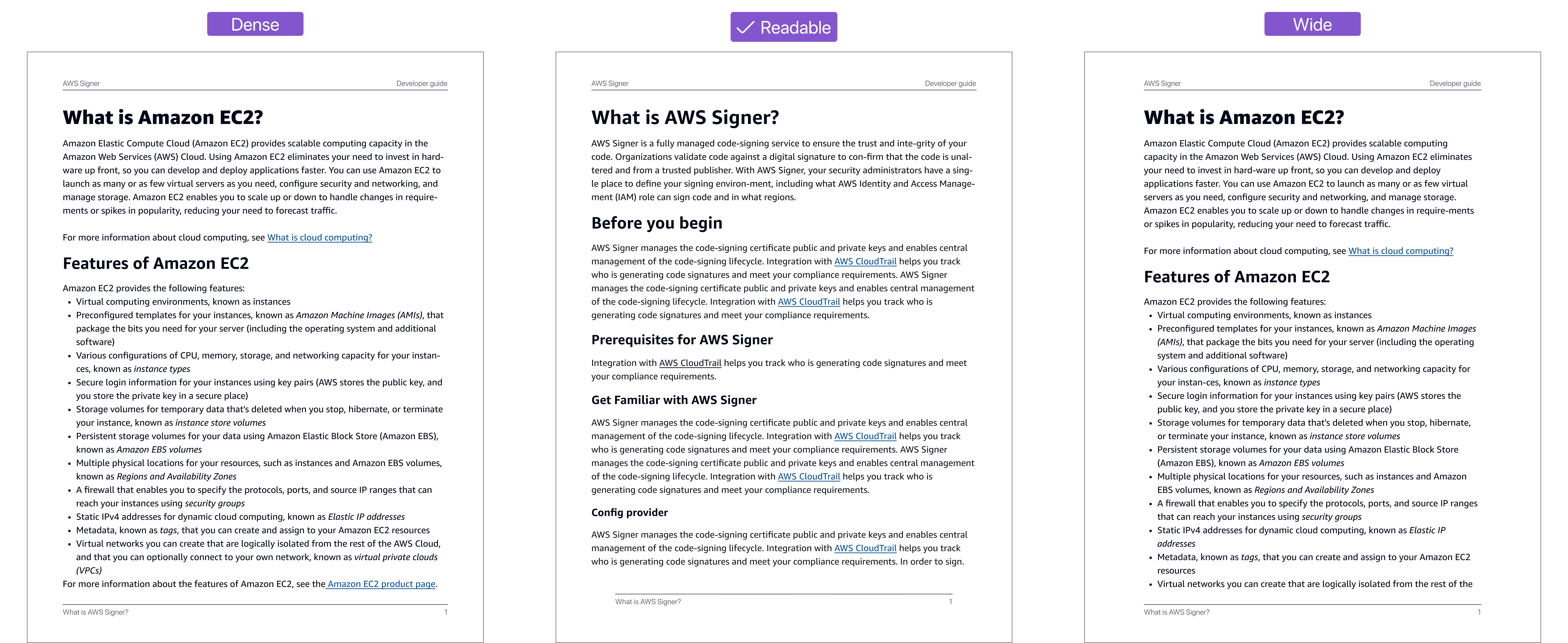 I ran three layout explorations — Dense, Readable, Wide — tested with 12 developers in timed implementation tasks. Readable produced 30% faster task completion, even though it generated longer documents. The density assumption wasn't just suboptimal — it was actively working against the use case.