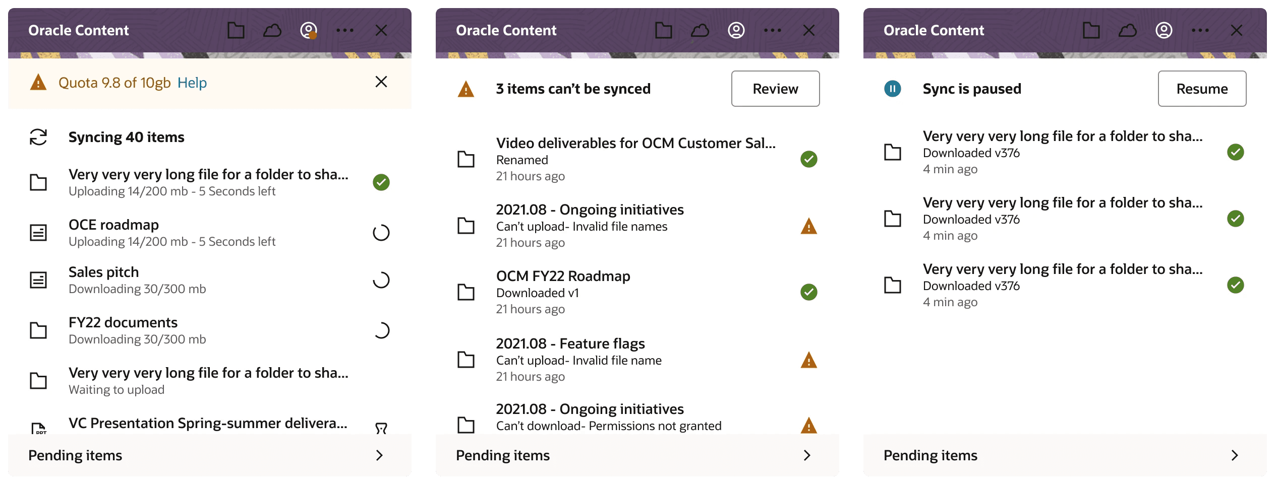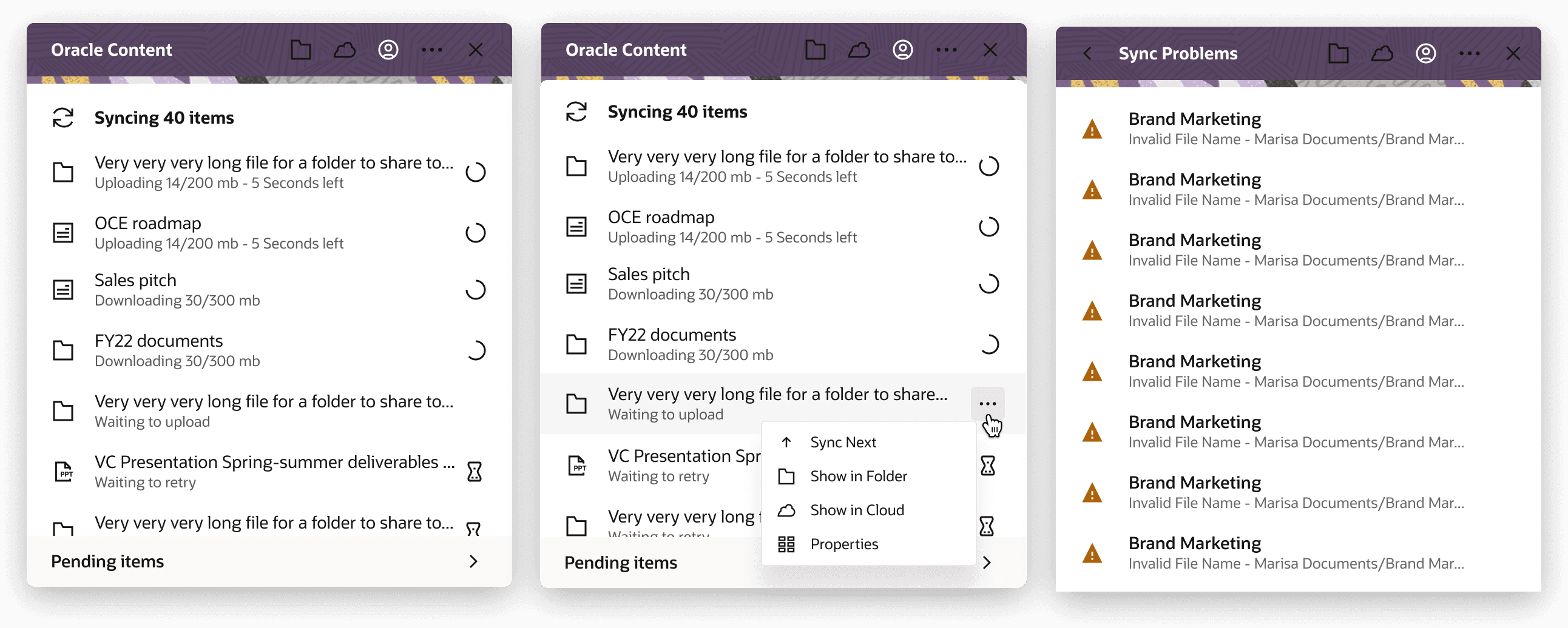 Designed the interaction model and visual system for Oracle Content Management's desktop sync app — enterprise infrastructure where the cost of uncertainty isn't frustration, it's broken trust.